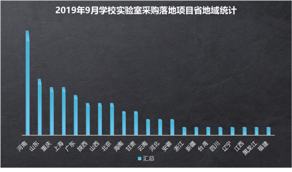 2019年9月,學校實驗室采購共149個項目,涉及21個省市自治區。在“雙一流”建設過程中,不少省市提出要實施“雙一流”科學研究計劃,即加強高校科研基礎條件建設,進一步充實完善高校實驗室、圖書資料等基本條件,推動高校科研公共平臺建設和數字化資源共建共享,建設一批布局合理、功能完善、體系健全、共享高效的科研創新平臺,全面提升高校科研基礎條件水平。